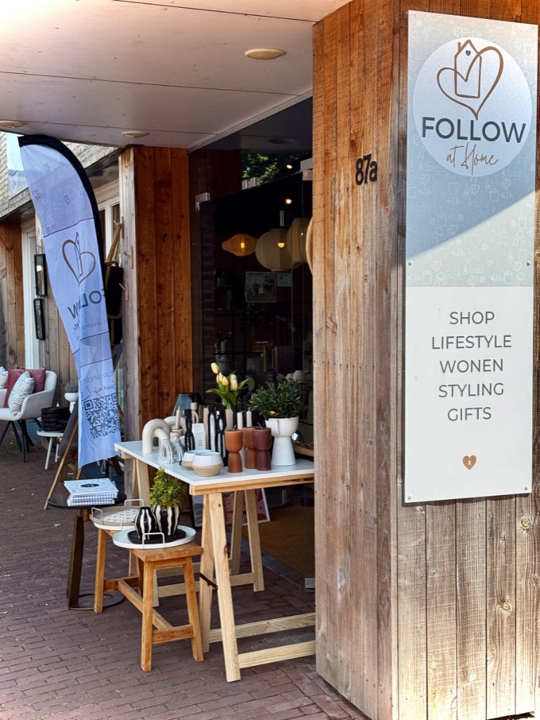 Naast mijn ontwerpstudio heb ik mijn interieurwinkel FOLLOW at Home waar inspiratie tot leven komt. Hier vind je meubels, accessoires en unieke items die perfect aansluiten bij mijn ontwerpen. Natuurlijk kun je er ook terecht voor veel leuke en bijzondere cadeautjes.